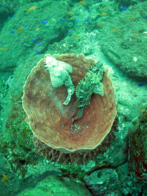 クロホシイシモチの群の真ん中を悠々と泳ぐハナミノカサゴが