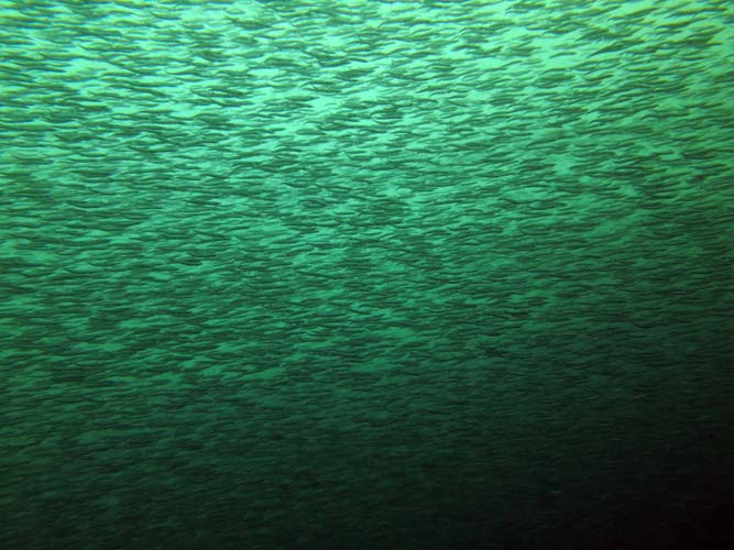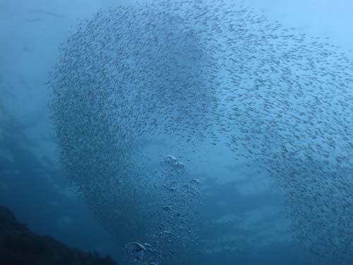 千年サンゴの周りを取り囲むようにして泳いでいるクロホシイシモチの大群には