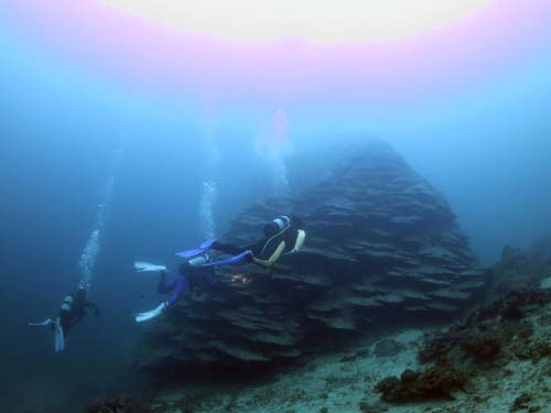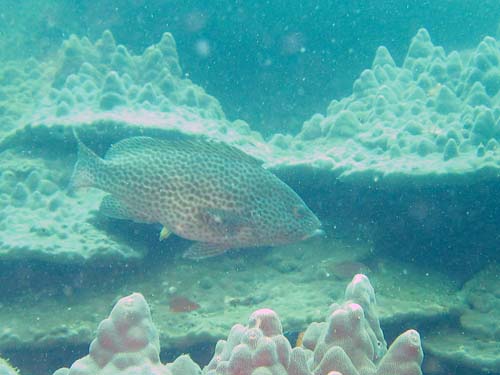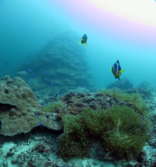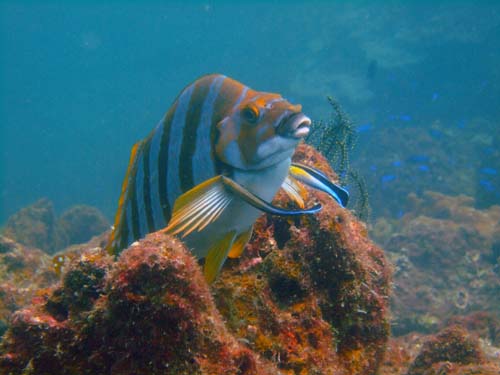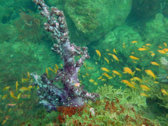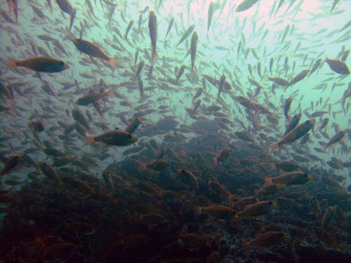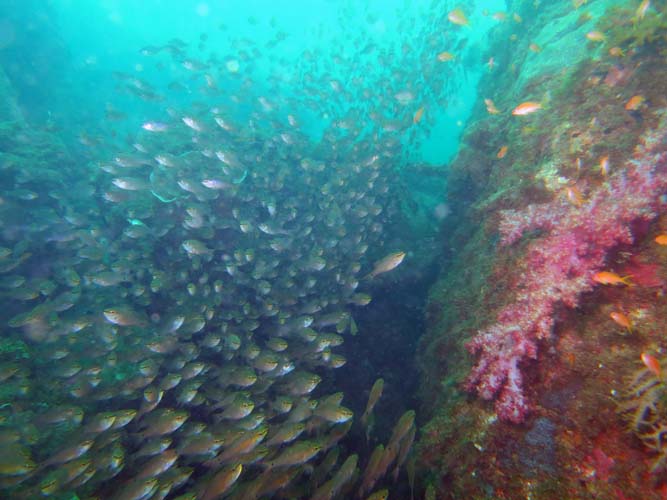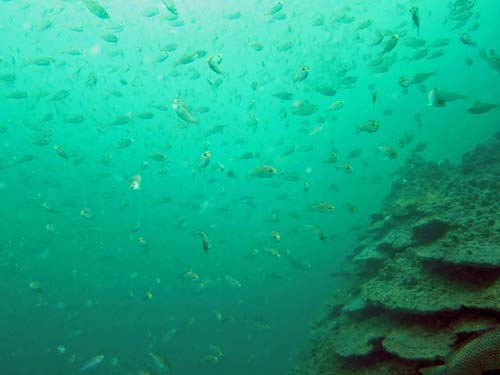 千年サンゴの周辺にはのっぴきならない数の小魚が群れをなしております