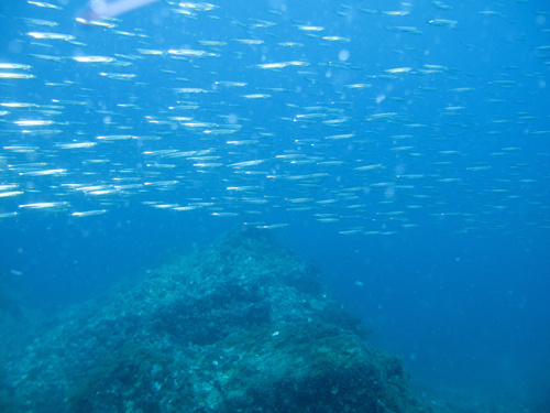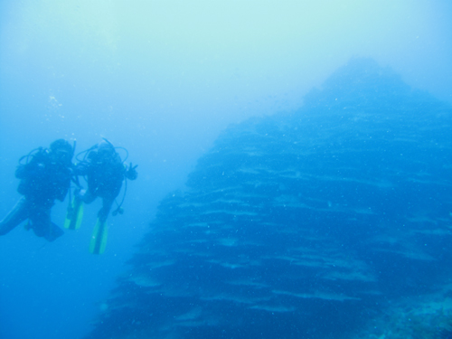 まずはネンブツダイの群れ、少し周りを見渡すと、、、現れましたイサキの大群!そしてその横を急いでキビナゴの大群が「ドワァーっ」と行き過ぎてました何か急いでるようで今にも僕たちめがけて突っ込んできそうでしたよ~