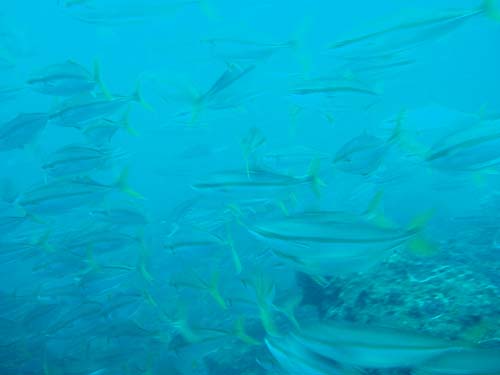 そのまま東の根を進むと途中でアジとイサキの群れに遭遇!見上げるとカツオが数匹!そして近くをハマチの群れが通過!迫力あります!