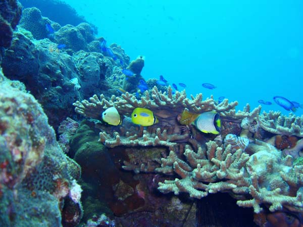 浅場のサンゴの間には、アケボノチョウ、ミスジチョウ、ヤリカタギ、スミツキトノサマダイ、