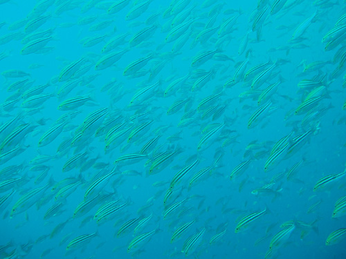 まずはタカベの大群にイサキ、アジ、クロホシイシモチの入り乱れた大群に圧倒され、深場ではハナゴンベやハナハゼ、浅場ではソラスズメダイやキンギョハナダイの大群に囲まれつつ、サンゴ周辺にいるヤリカタギやメガネゴンベなどがかわいいし、アオブダイやイシダイなどの迫力ある魚も!