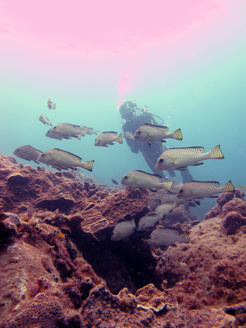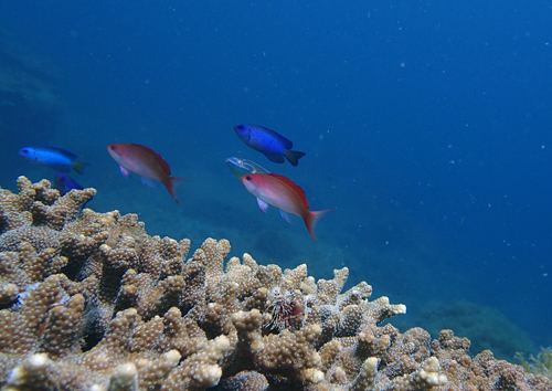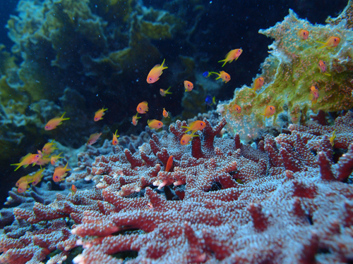 水中でひときは華やかで目立っているのはキンギョハナダイの群れ