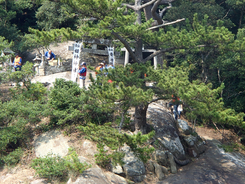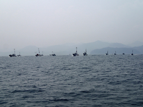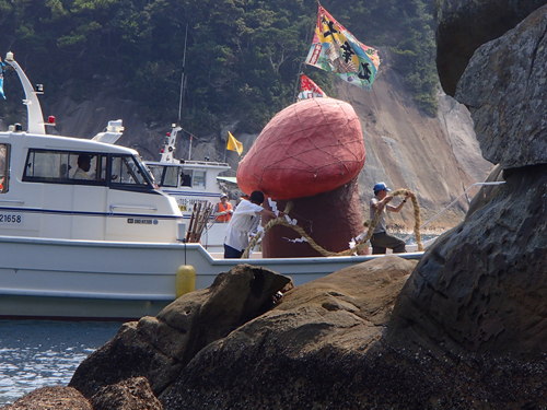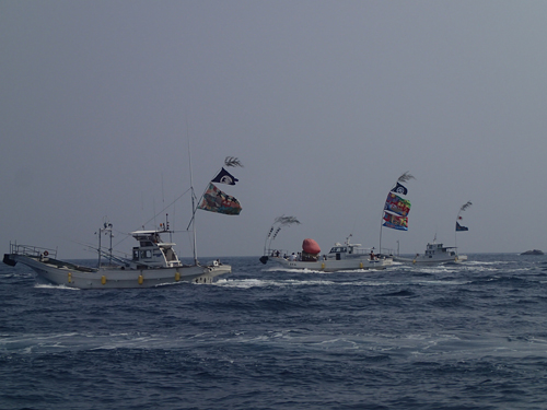 大島桟橋のすぐ横にある神社に向けて続々と船がはしる様は