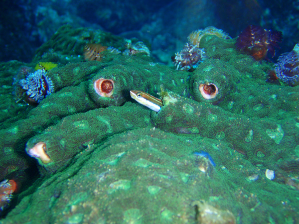 透明度がいいですね~ハマサンゴ周辺に群れるクロホシイシモチがハマサンゴの迫力を倍増させている感じがしました!周辺にはミスジスズメダイやテンクロスジギンポも発見しましたよ!
