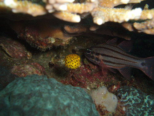 浅い根の隙間には、ミナミハコフグの幼魚、コウイカが隠れていました。ダイバーにちょっとビックリ!?