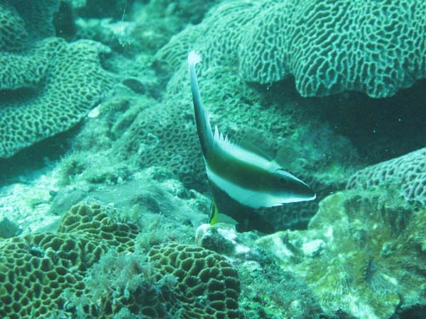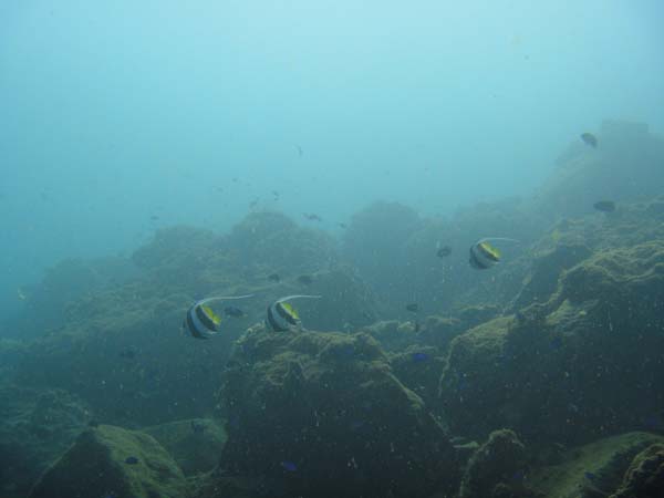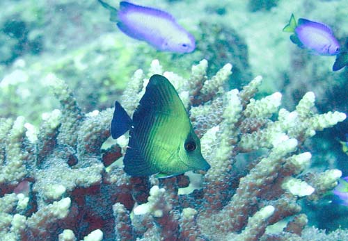 サンゴの間にはヤリカタギ、ミスジチョウチョウウオ、スミツキトノサマダイ、