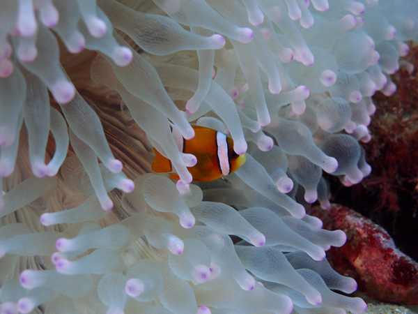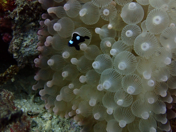 イソギンチャクにはたっくさんのミツボシクロスズメダイ。今年はやけに目に付きます。
