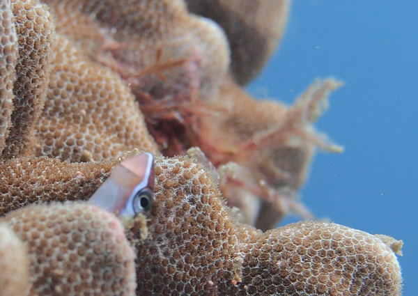 まずは岩陰から顔を出すホウセキキントキ。体色は赤と白のまだら。