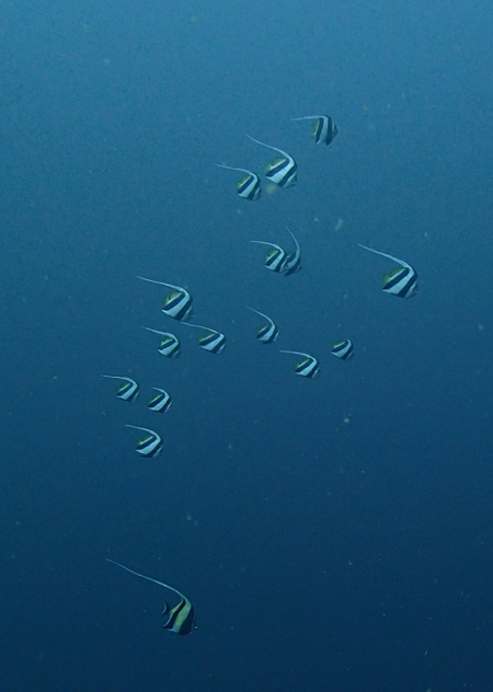 浅場のサンゴの間では、ミスジチョウチョウウオ、トノサマダイ、ツノハタタテダイ、
