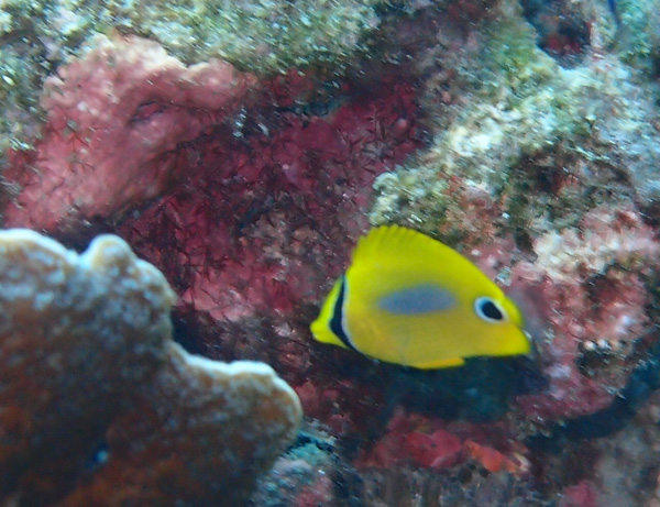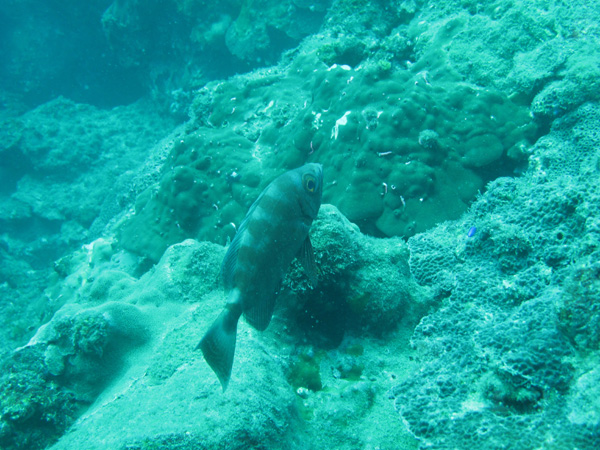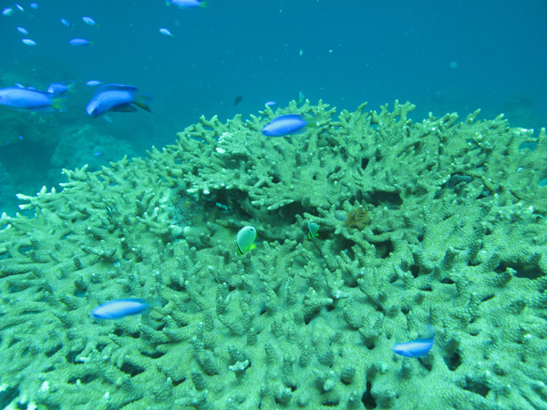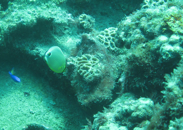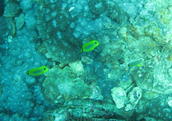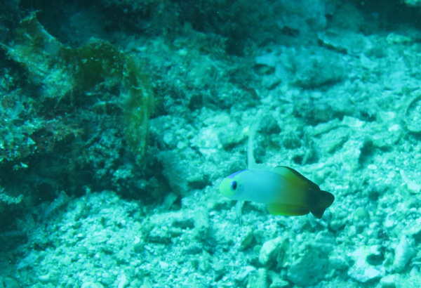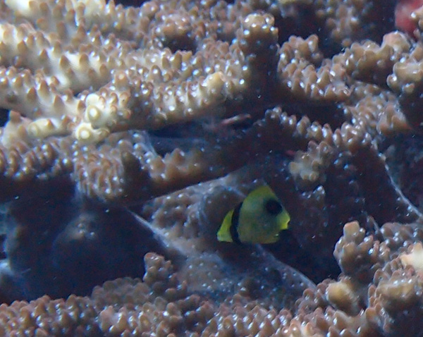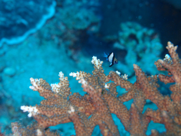 浅瀬では、フタスジリュウキュウスズメダイ、ミナミハタタテダイ、ミスジチョウチョウウオ、
