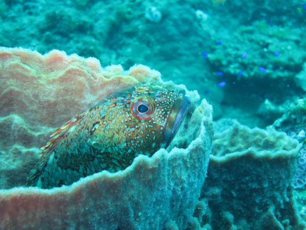 スリバチカイメンにはカサゴが休憩していました。