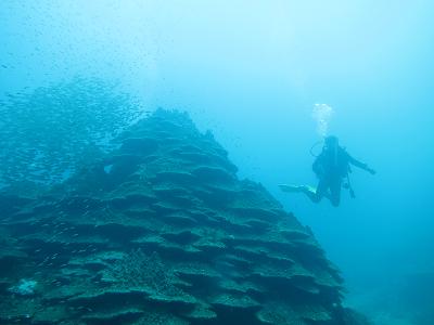 まずはやはり千年サンゴ!最近はクロホシイシモチの幼魚も群れているのでサンゴがさらに大きく見えます!