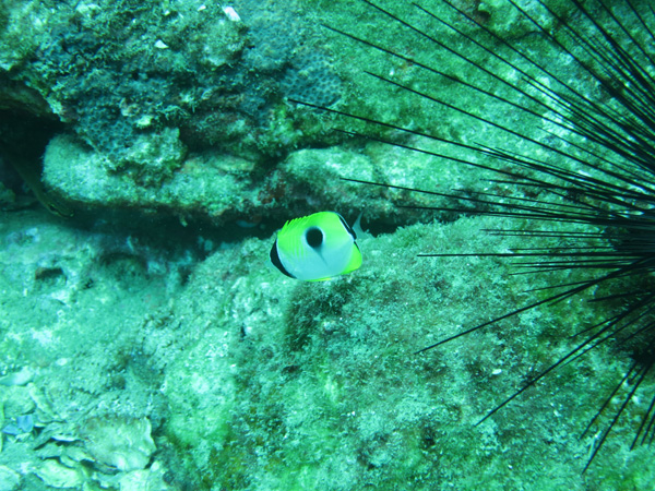 浅瀬のサンゴの間には、ミナミハタタテダイ、ヤリカタギ、トゲチョウチョウウオ、