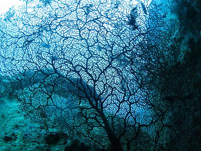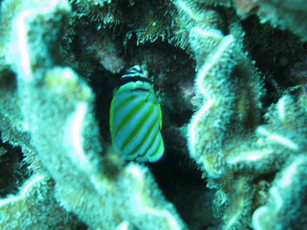 サンゴの間にはキモガニ、ミスジチョウチョウウオ、ヤリカタギ、フ