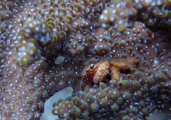 サンゴの隙間にはキモガニ、フタスジリュウキュウスズメダイ、