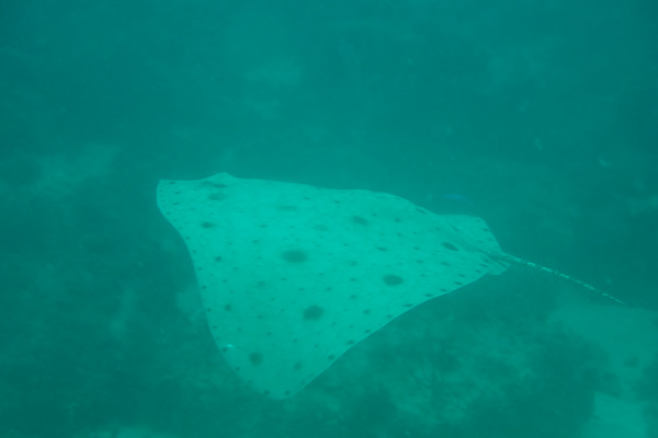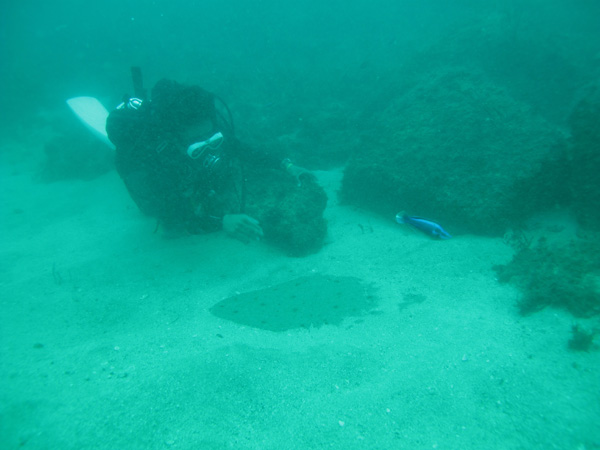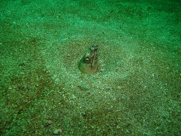 そして砂地へ進むとまずはカワイイ、アカエイのこども!ホタテウミヘビ、ゼブラガニ、マダコを発見!