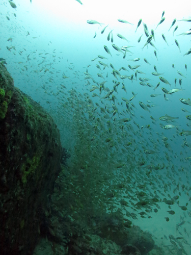 アジの大群、シマアジ30匹ほど、コロダイの幼魚、キビナゴの大群、オニカサゴがいました!