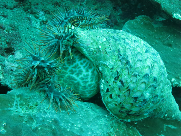 近づくと、なんとなんと大きなほら貝がオニヒトデを捕食中でした!!!