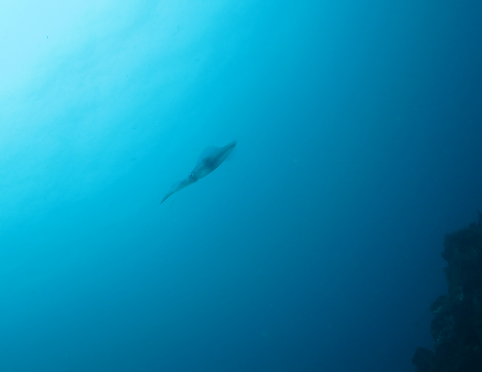 水面近くにはアオリイカが1匹。ゆっくり泳いでいたので近づいてみると、、、