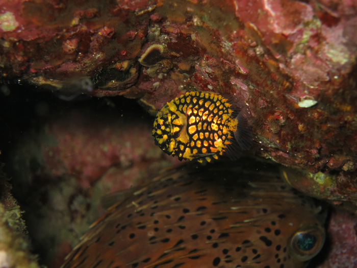穴の中に小さなマツカサウオを確認!4㎝サイズの幼魚でした!めっちゃ可愛いですよ~!その後ろになぜかほとんど動かないハリセンボンがいます!きっとさ寒さで体が動かないんですね!人と同じや!魚の皆さんご苦労様です!