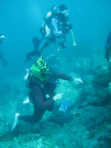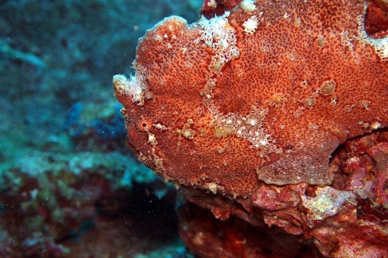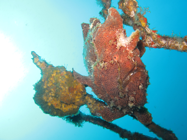 オニヒトデ退治中のスタッフが綺麗なオレンジ色のオオモンカエルアンコウに