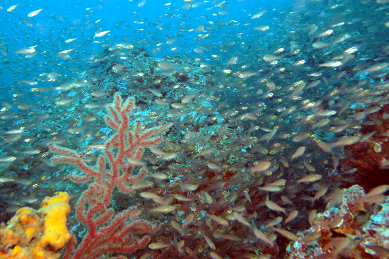 浅場に移動するとキンメモドキとクロホシイシモチが雲海のようになってお出迎えしてくれて、アジにはブリの群れがタックルしまくり(☆_☆)♪♪