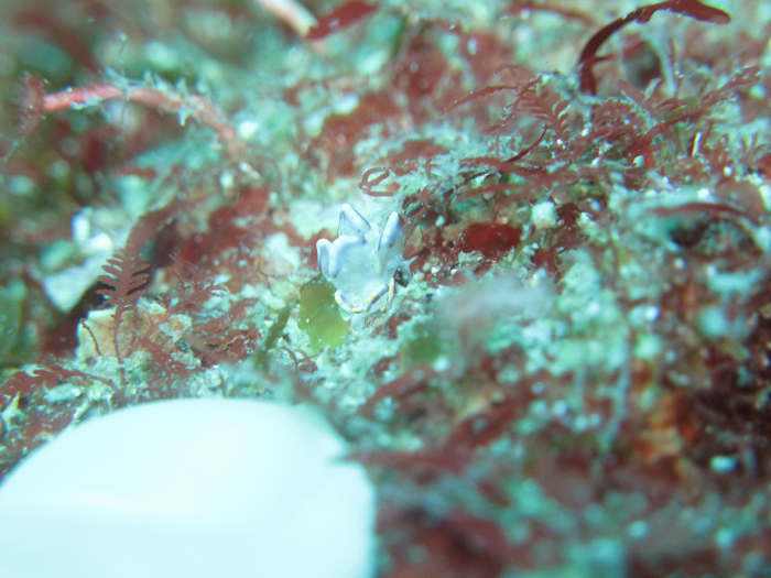 さらにフジイロウミウシやシロウミウシ、ミツイラメリウミウシを観察すると側にあるフクロノリについている点が気になりじっくり見るとなんとハナビラウミウシでした!極小で写真がちゃんと撮れませんでしたが一緒に写っているのはぼくの指です!!サイズを想像してみてくださいね!ここで千年サンゴに到着、そのままシロミノウミウシを観察して1ダイブを終えました!かなり移動距離も短く近場に生物が密集したダイビングでした!