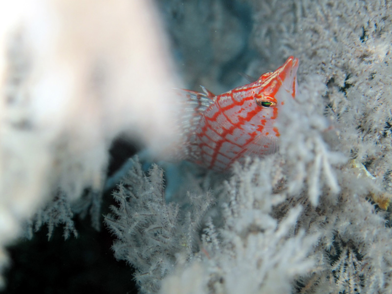 岩についている白い色のウミカラマツには赤色チェックが可愛らしいクダゴンベが隠れていました(*^∀^)