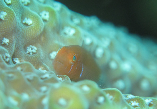 サンゴの隙間からじーっとしてくれてました!オレンジ色の体に緑色の目。