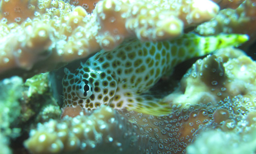 千年サンゴにクロホシイシモチが覆いかぶさり、オオモンハタがハンターとになっている姿は