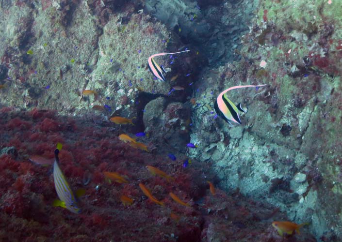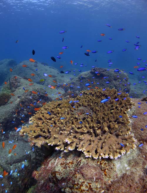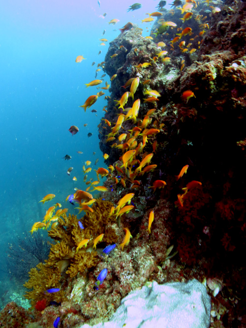 キンギョハナダイやソラスズメダイなどのカラフルな小魚たち