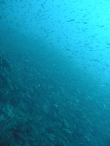 イサキにマアジにネンブツダイ、キンメモドキ、コガネスズメダイなどすごく多い群れで本日もやはり突っ込んじゃいましたよ!