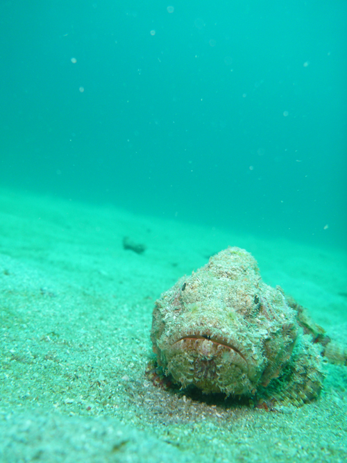 こちらも青い~♪ 潜降していくと、水底にはオニカサゴが潜んでいました。