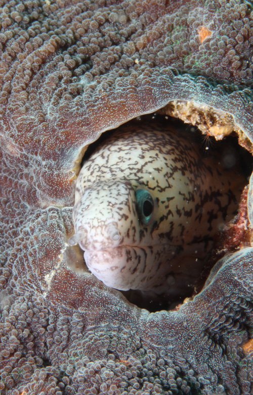 スリバチカイメンにウツボが休んでいました! そして少し離れた岩陰には巨大なイセエビが!!!