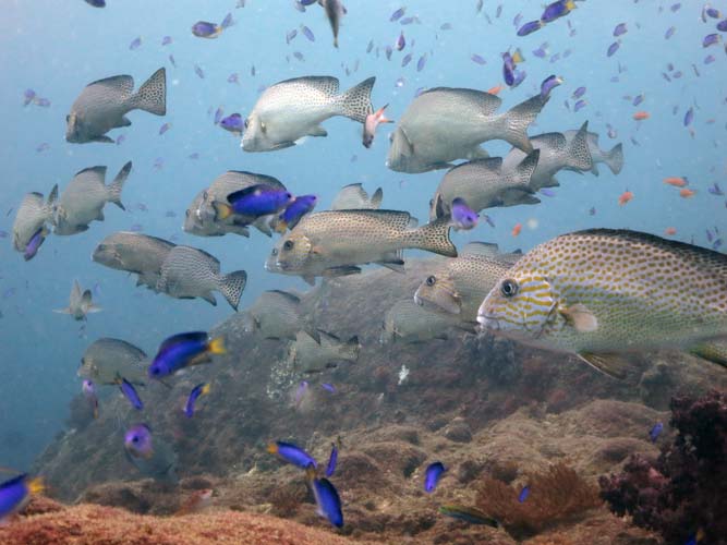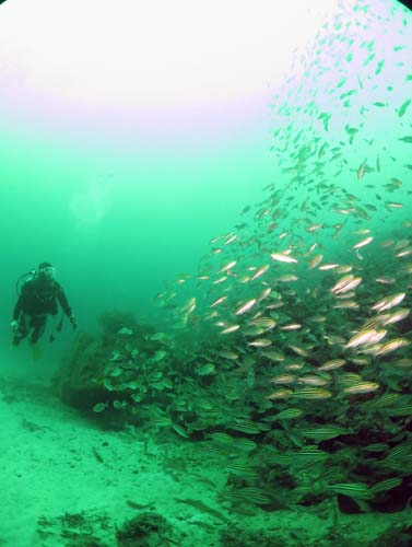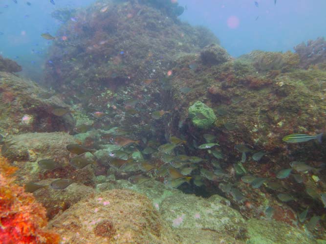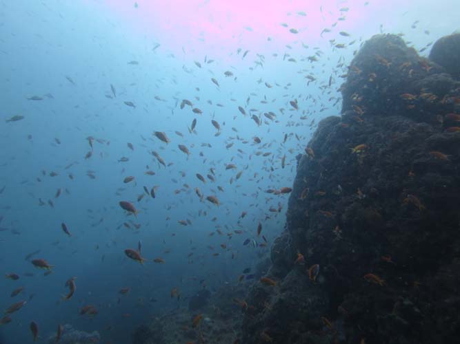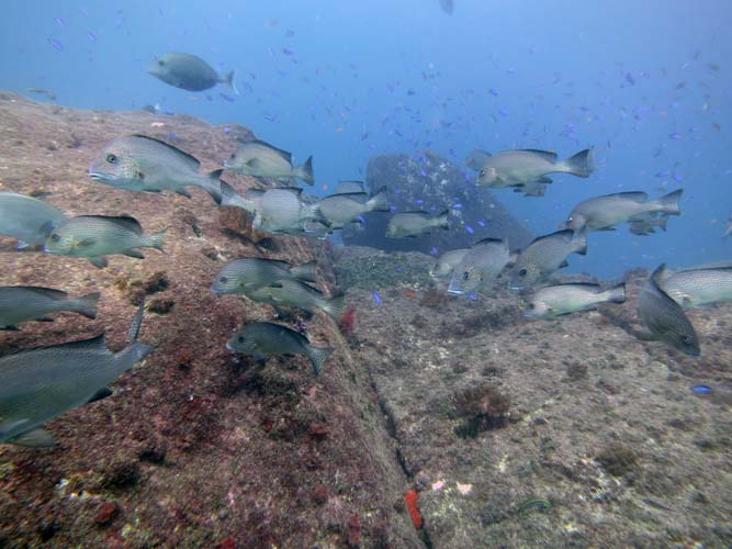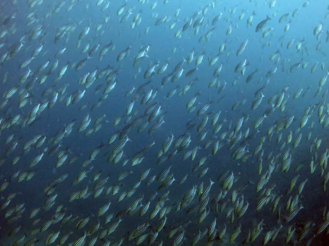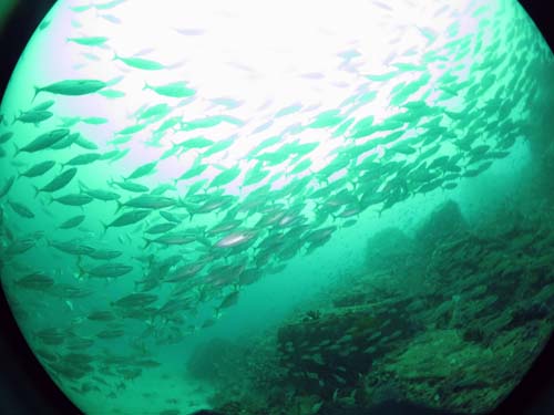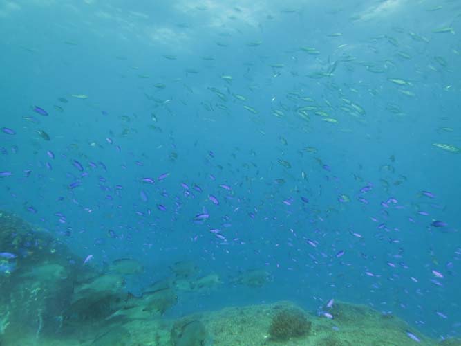 イサキ、マアジ、ネンブツダイの大群に加えて、ブリのハマチサイズがイサキの群の様に僕たちの周りを囲みすごい迫力!