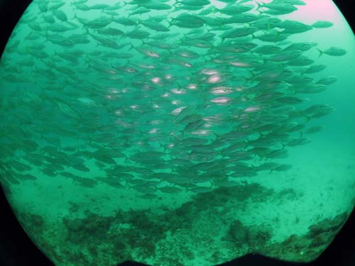 水中ではアジの群キビナゴの群が間近まで大群で押し寄せる